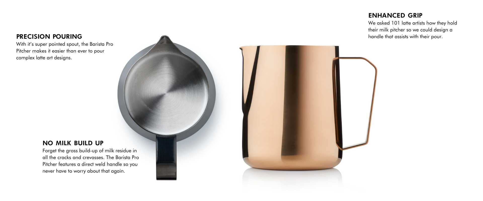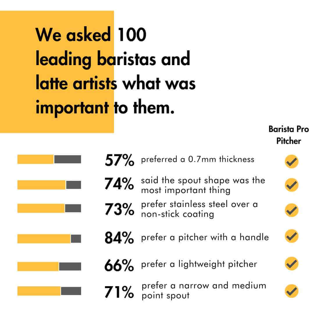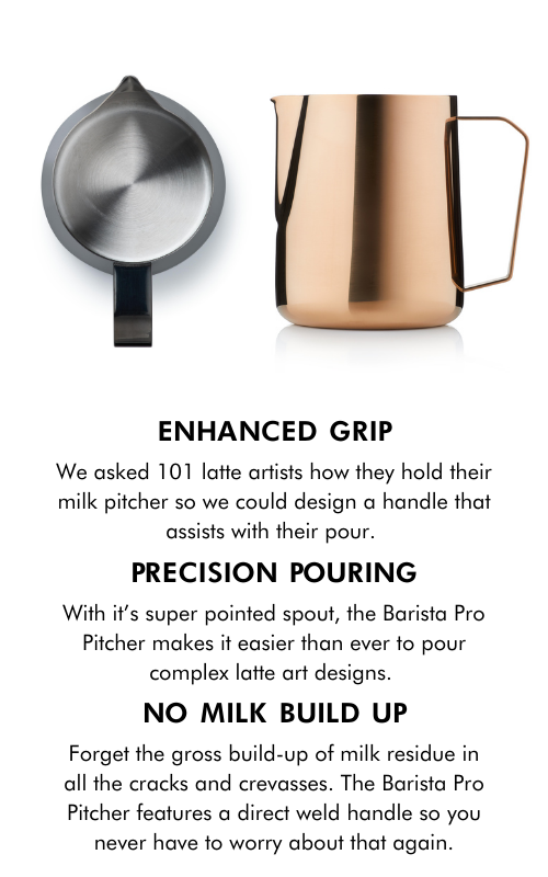 Designed to win championships, the Barista Pro Pitcher has a uniquely shaped pouring spout, welded stainless steel handle and a thinner gauge - all designed for maximum precision and accuracy.